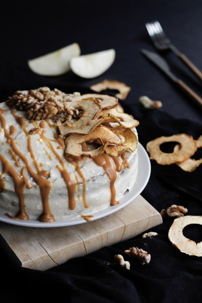 - Na kraju ostatkom kreme prekrijte cijelu tortu pa ukrasite čipsom od jabuka i orasima te prošarajte kikiriki maslacem. Ako vam je kikiriki maslac jako čvrst, možete ga lagano zagrijati na vatri, uz dodatak male količine kokosovog ulja, kako bi se sve dobro otopilo i sjedinilo. Tako će vam biti lakše ukrašavati jer će maslac lakše kliziti sa žlice.